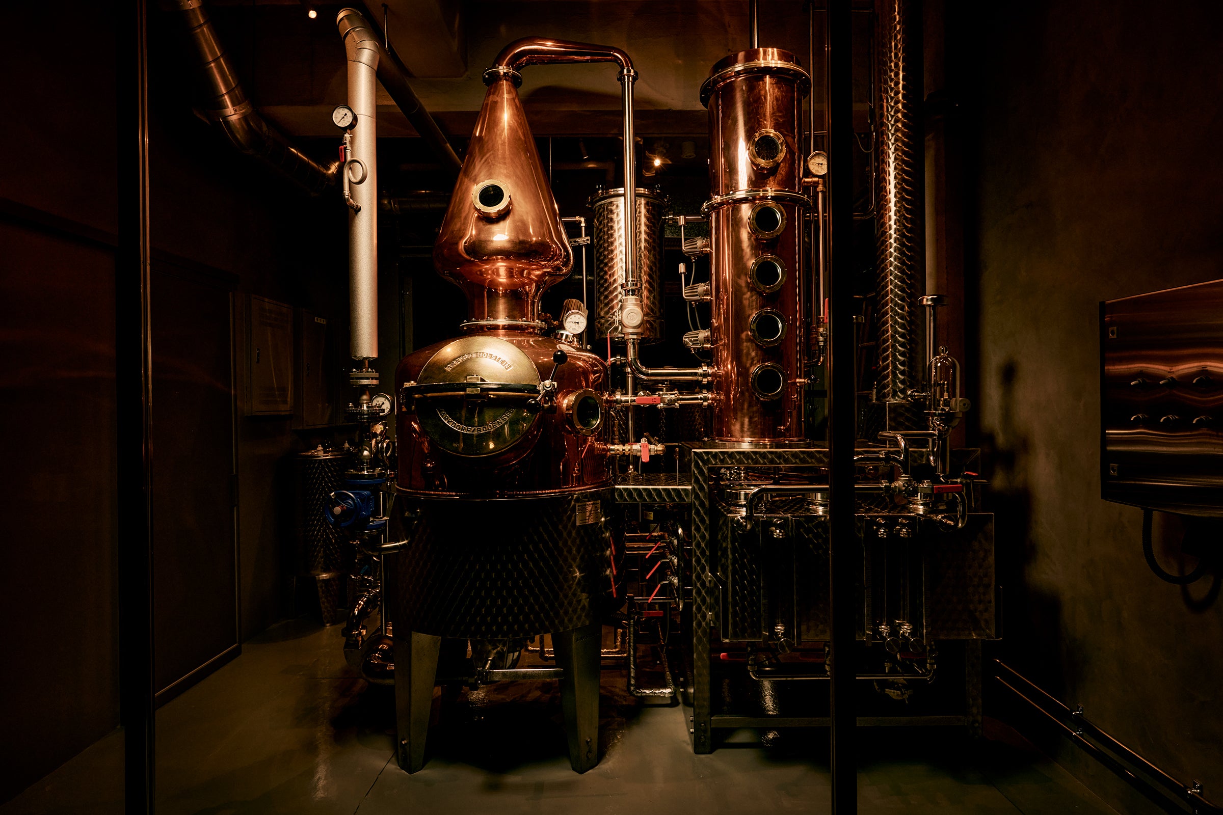 圧倒的な存在感を放つ蒸留器「アーノルドホルスタイン」の迫⼒を⽬の前にお酒を楽しむことができる、稀有な蒸溜所です。